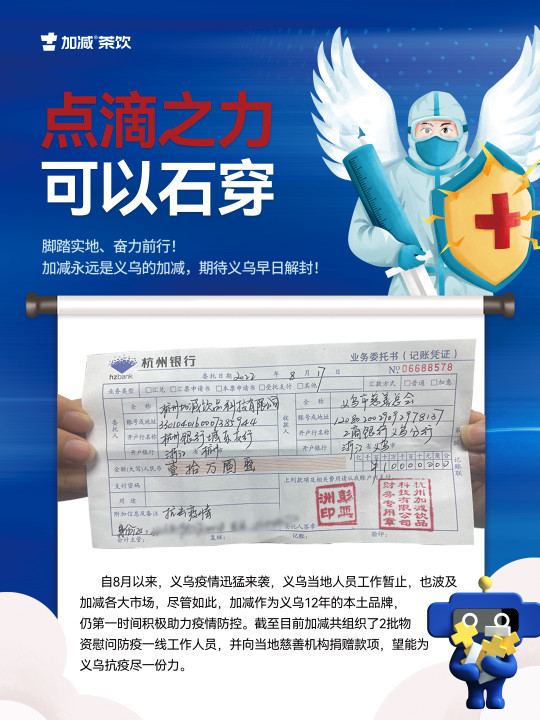 2022年8月11月,因义乌突如其来的疫情,整座城市按下了暂停键,全民进入静默期。在这场新冠肺炎疫情爆发期间,作为深耕义乌发展12年的凯发茶饮,主动发扬本土企业的社会担当和责任。截至2022年8月17日,公司共组织了2批物资慰问一线人员,并向当地慈善机构捐赠爱心款项。脚踏实地、奋力前行!凯发以实际行动为打赢疫情防控战贡献力量!